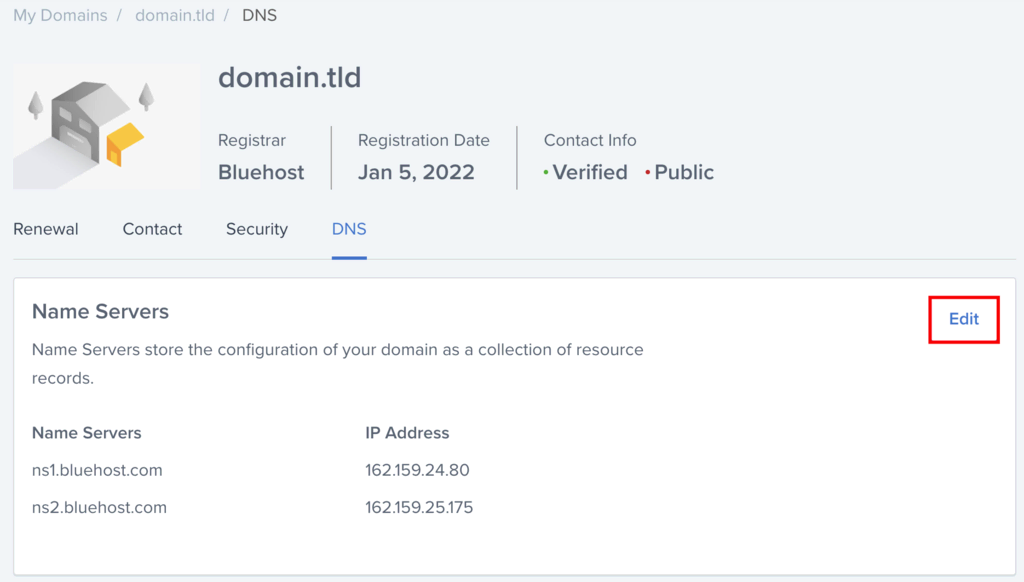 Wijzig bij Bluehost de naamservers door naar de sectie Mijn domeinen te gaan.
