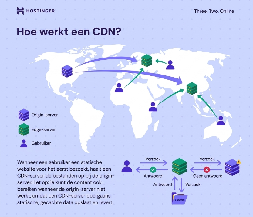 CDN’s gebruiken ook websitecaching, waarbij statische bestanden op edge-servers worden opgeslagen voor snellere toegang. Dit verlaagt de belasting van je hoofdserver en vermindert het bandbreedteverbruik.