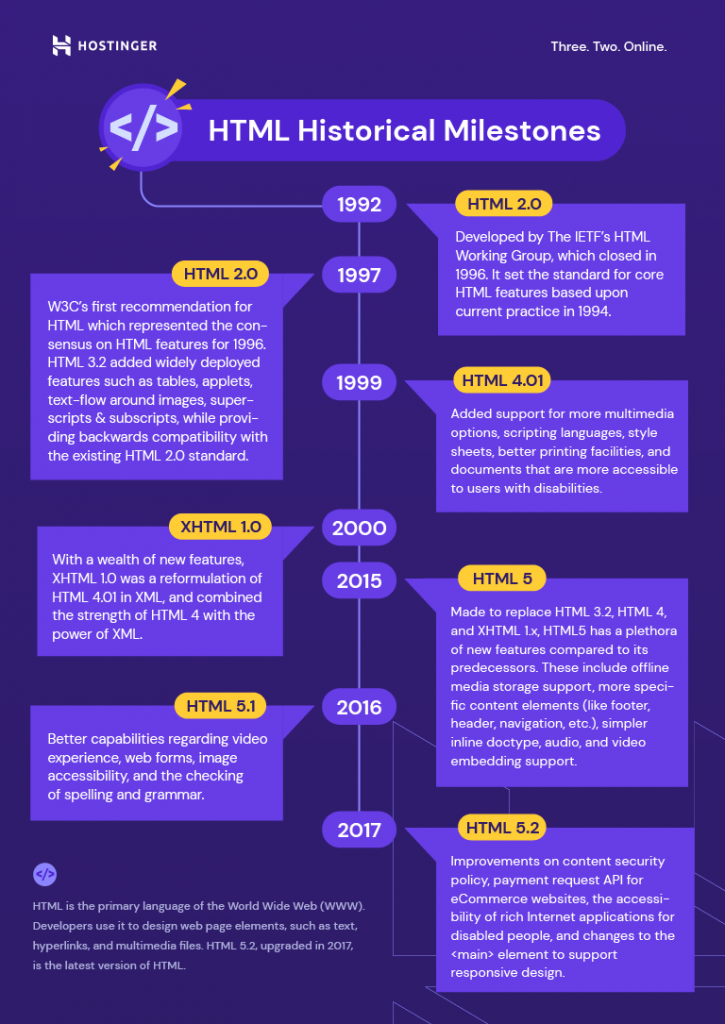 De eerste versie van HTML bestond uit 18 tags. Sindsdien zijn er bij elke nieuwe versie nieuwe tags en attributen aan de opmaak toegevoegd. De belangrijkste upgrade van de taal tot nu toe was de komst van HTML5 in 2014.