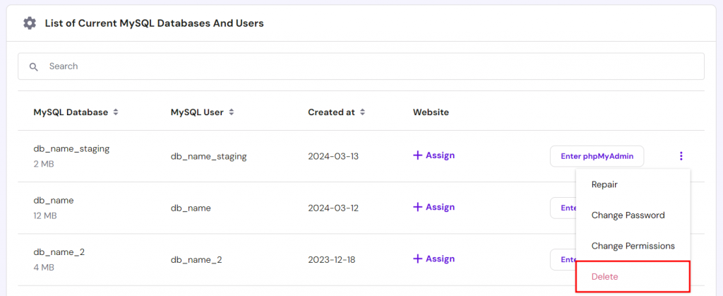 1. Ga naar de Lijst van huidige MySQL-databases en gebruikers in hPanel via Databases → Beheer. Klik op het pictogram met de drie puntjes naast je staging database en kies Verwijderen. Lees de disclaimer en klik op Delete om te bevestigen.