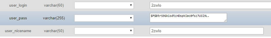 Om je WordPress wachtwoord te wijzigen, moet je de inhoud van de Value kolom in de user_pass rij vervangen.