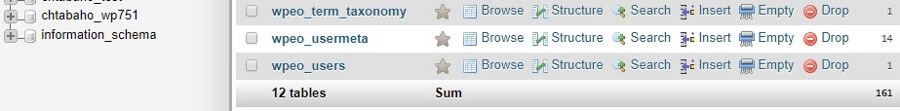 We gaan nu terug naar het tabblad Structuur bovenaan het scherm. Je ziet dan opnieuw alle tabellen van je database. De tabel die je zoekt, zou wp_users moeten heten: