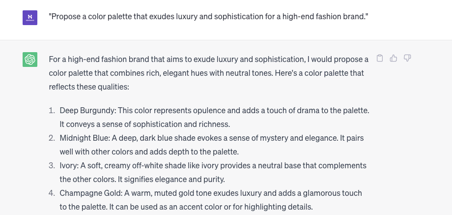 - “Propose a color palette that exudes luxury and sophistication for a high-end fashion brand.”
