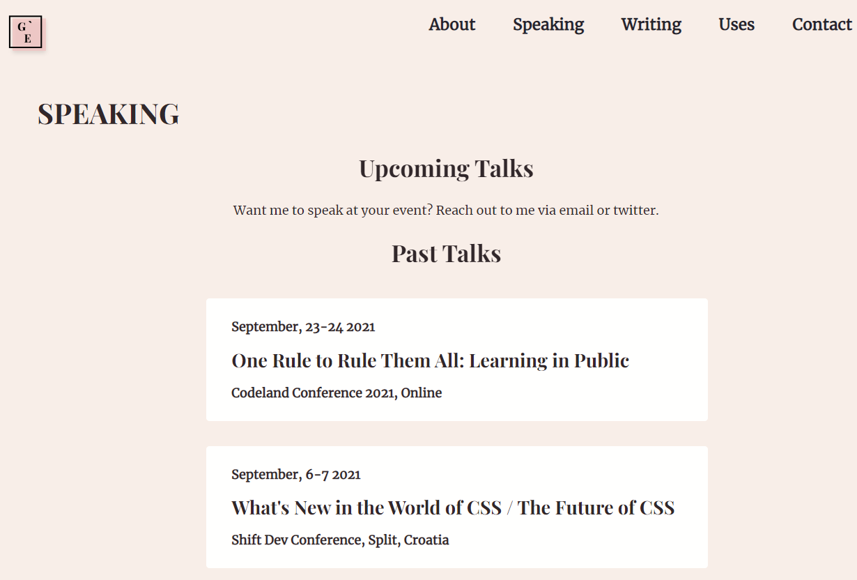 Gift showcases her expertise by exploring different platforms. Her portfolio website has a blog section, where she posts web development tutorials and career tips. She also shares her experience as a speaker in various tech events both on the site and on her YouTube channel.
