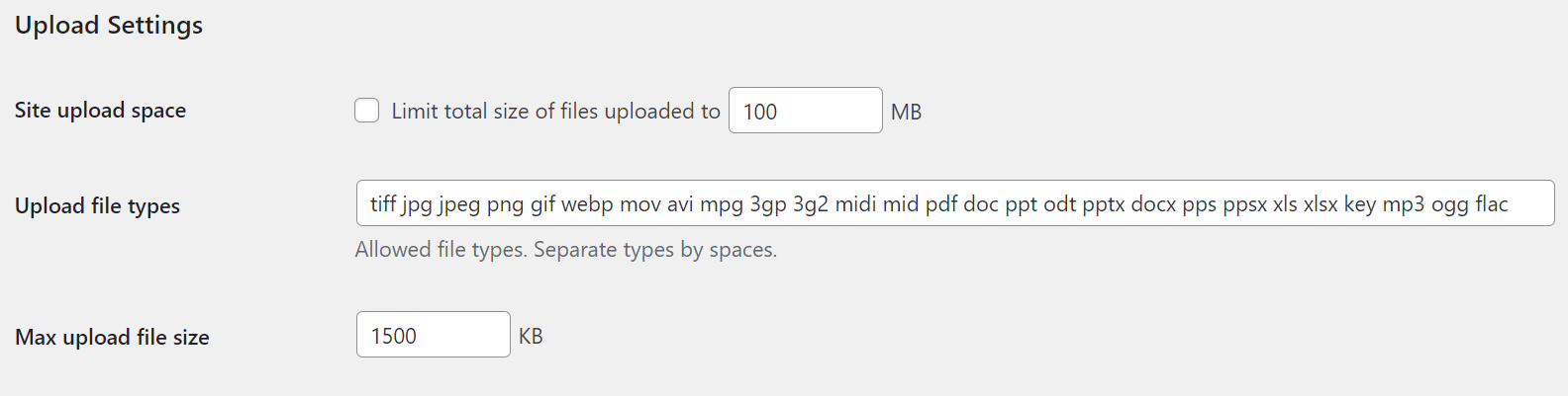 The Upload Settings section on the WordPress Multisite dashboard