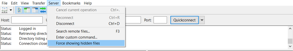 2. If you can’t find the file, there’s a chance it’s marked as a hidden file. In this case, click the Server button on the menu bar and choose the “Force showing hidden files” option.Screenshot showcasing FileZilla's force showing hidden files option