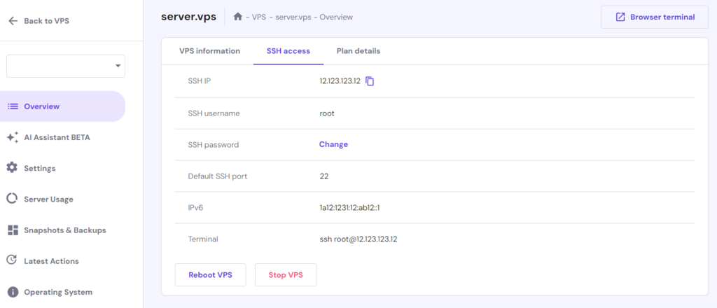 For a remote machine like VPS, connect using an SSH application or Terminal. Hostinger users can find their remote machine login credentials by navigating to VPS overview → SSH access in hPanel.