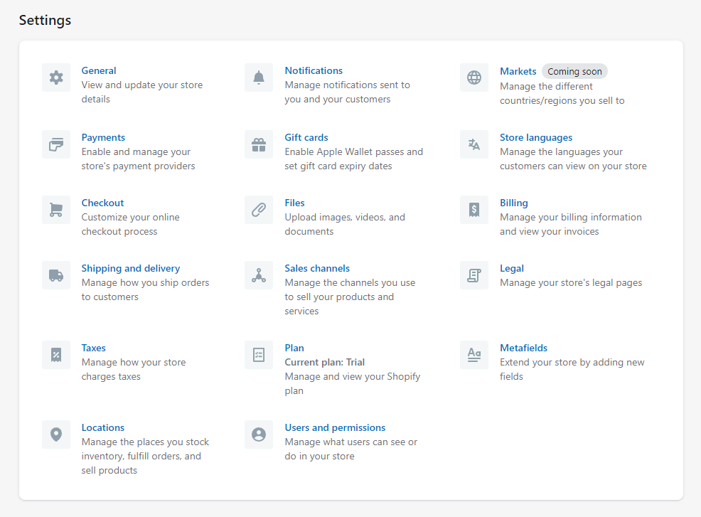 - Store management. The product settings, payment gateways, and shipping options.