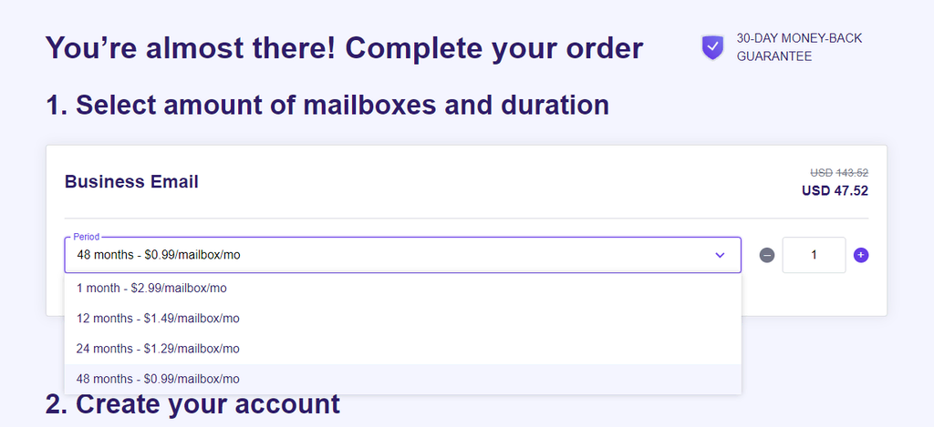 The final cost will be determined by the number of mailboxes you need and your subscription length. Committing to a longer period often lowers the monthly per-mailbox price.