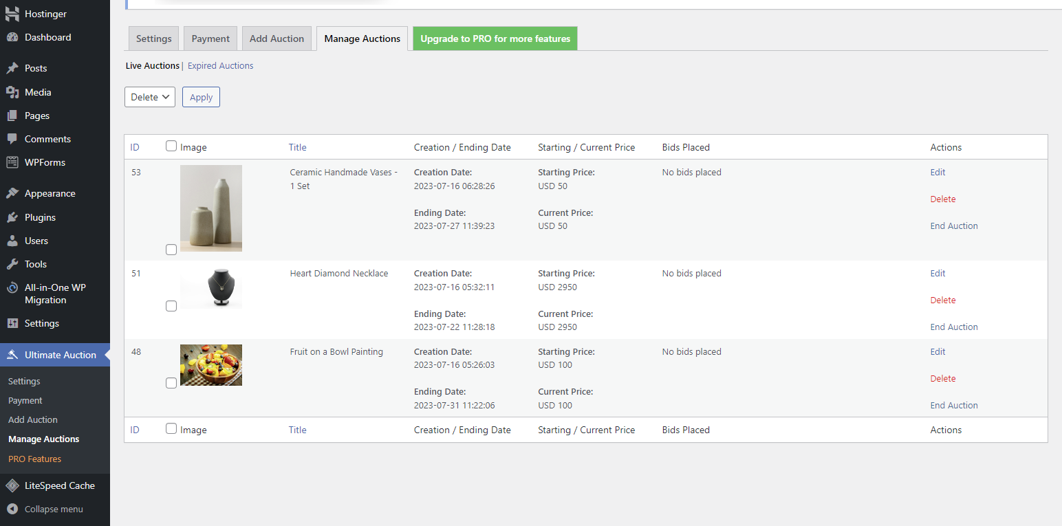 With our chosen WordPress auction plugin, you can supervise all the ongoing auctions and bids in the Manage Auctions tab.