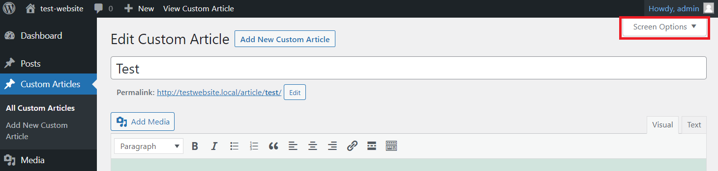 WordPress provides us with a built-in tool to add a custom field. Since it is hidden by default, activate it by going to the Post Editor → Screen Option.