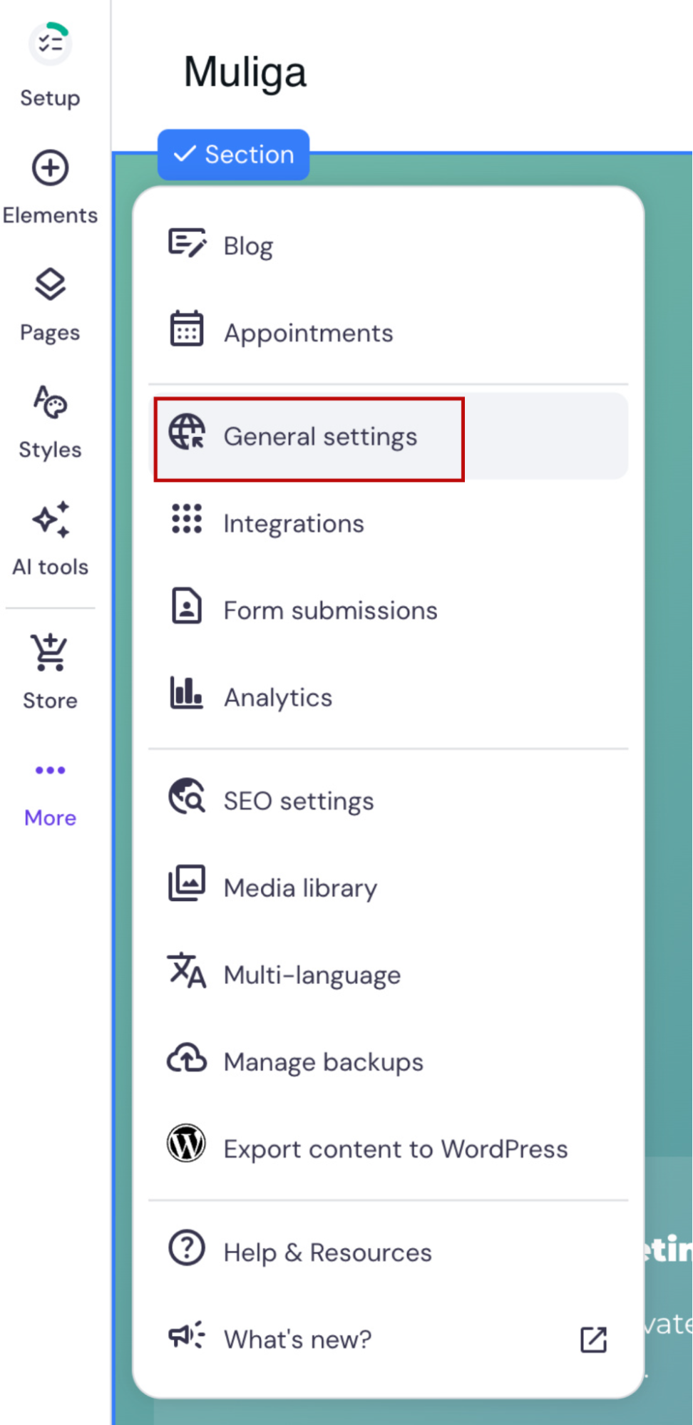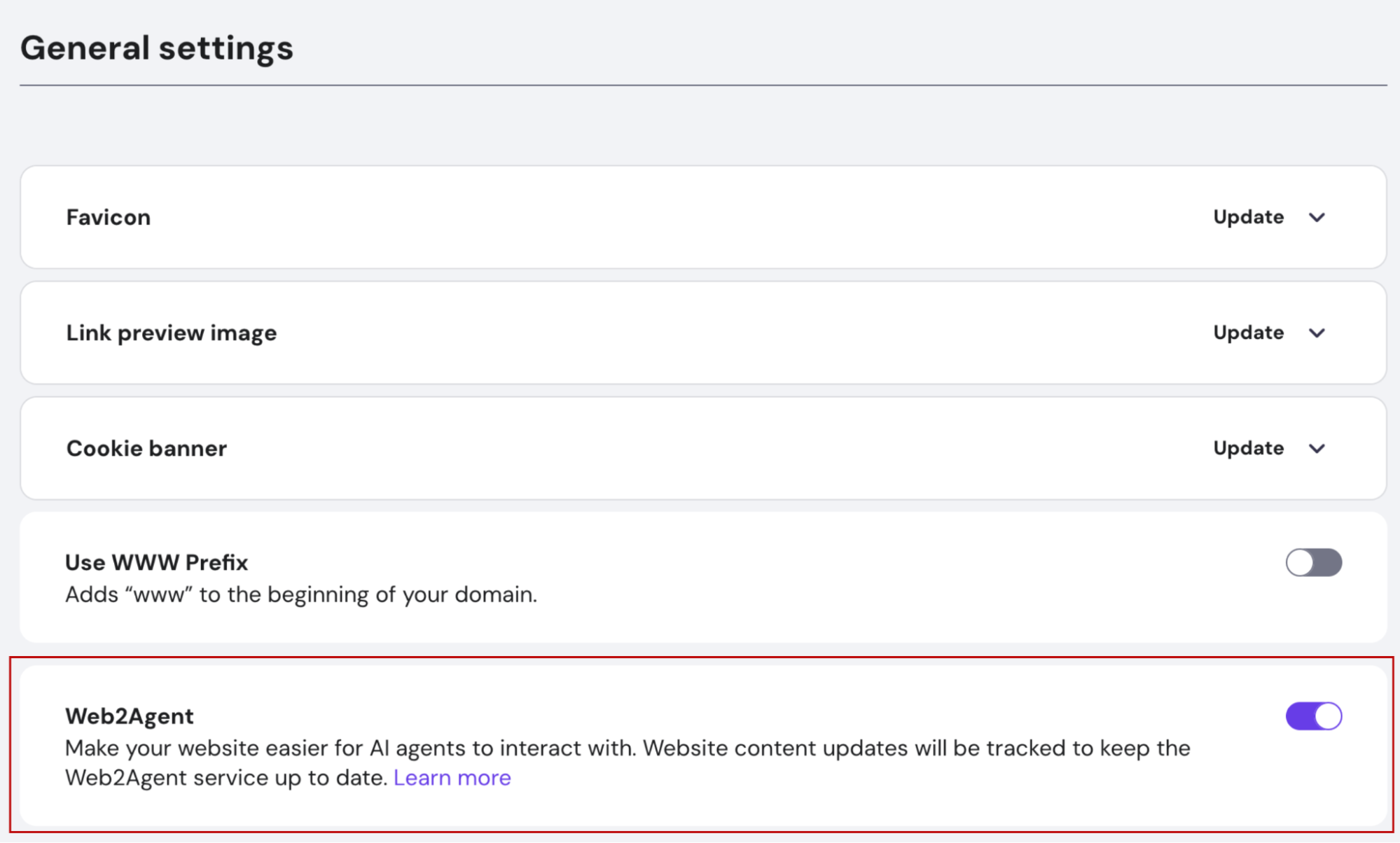 The process is similar for Hostinger Website Builder. Go to your website’s general settings and enable the Web2Agent feature there.