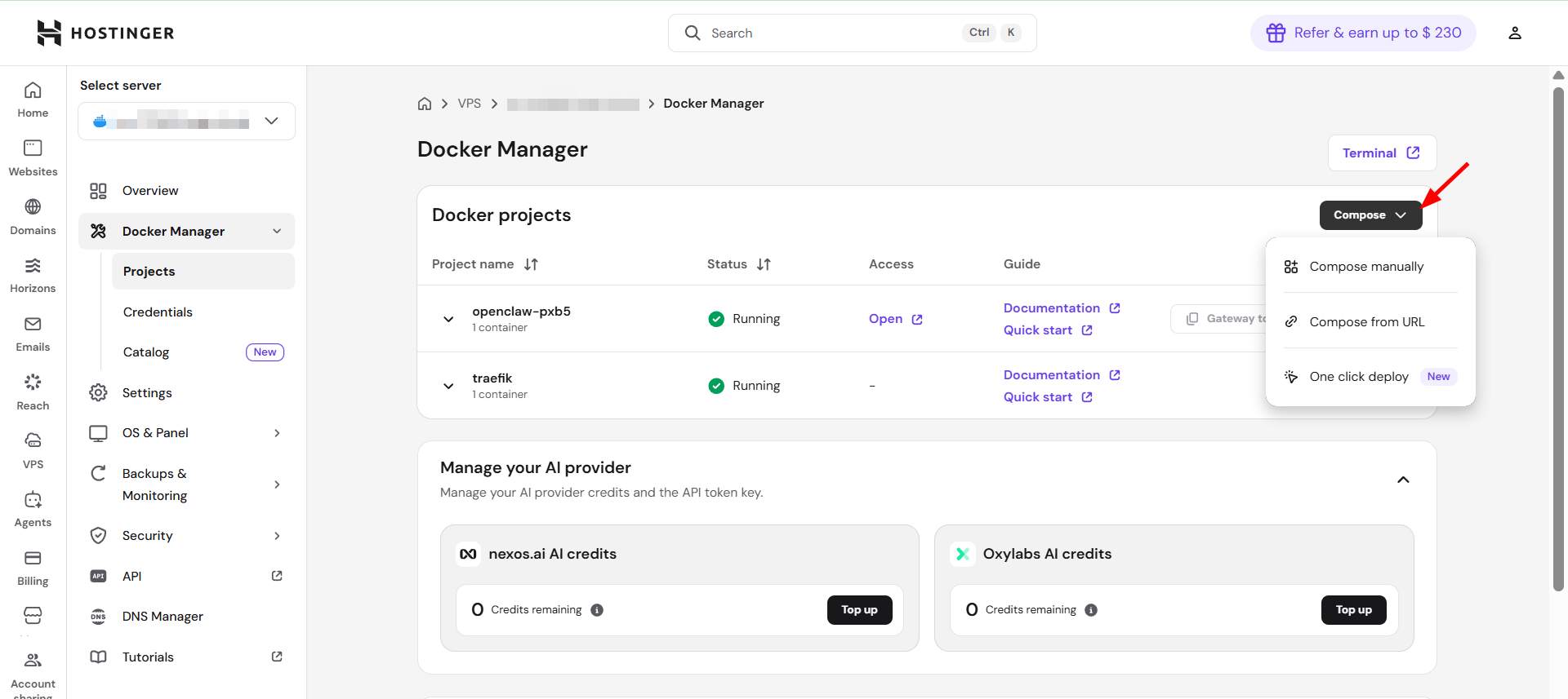 Click “Compose” then choose between “Compose manually”, “Compose from URL”, or “One Click Deploy”