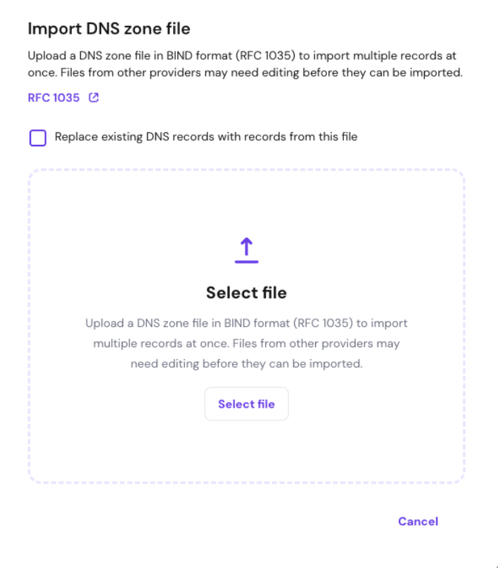 hPanel also allows you to bulk import and export DNS records using a standard BIND zone file.