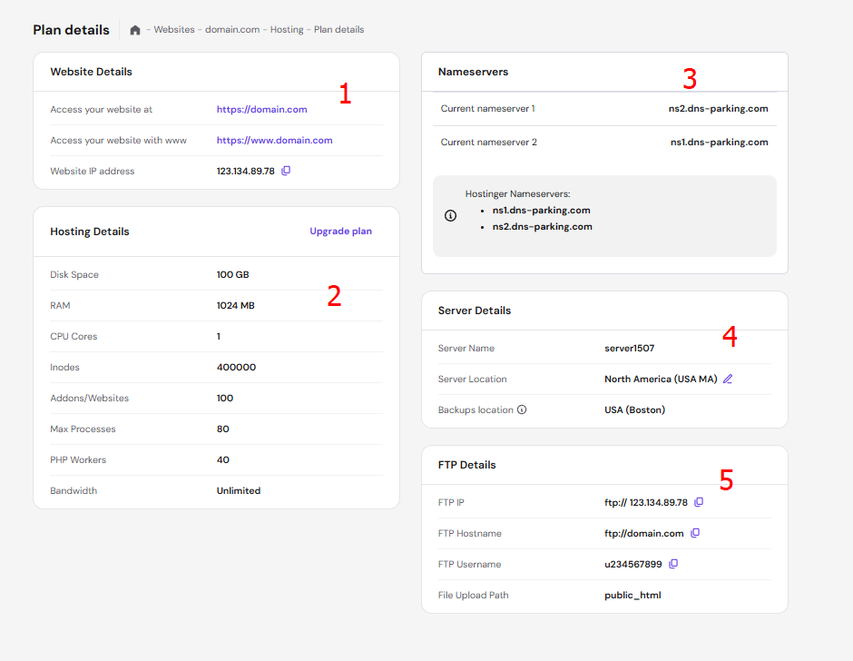 3. Nameservers — the current NS records on your domain as well as the Hostinger values. Make sure to check on how to point a domain to Hostinger if your domain is purchased elsewhere.