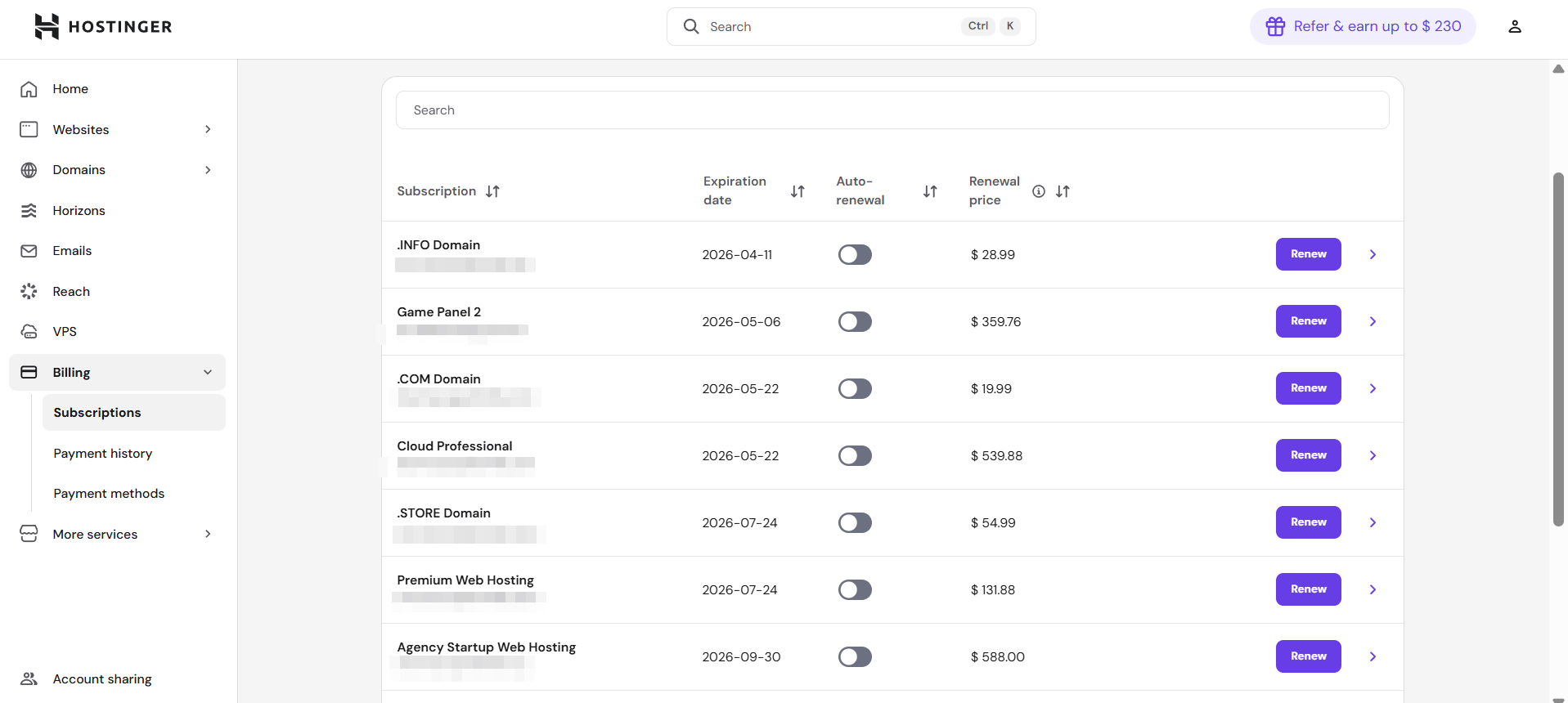 Auto-renewal is now managed via a toggle switch on the subscription row. Click the toggle to enable or disable auto-renewal for each service individually. When auto-renewal is enabled, Hostinger charges the saved payment method before the expiration date (27 days for domains, 14 days for yearly plans, 1 day for monthly plans).