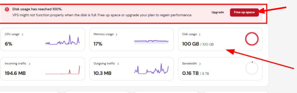 If you notice your disk usage is high, you can investigate further via SSH. The following commands help identify what is consuming disk space: