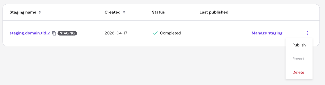 After publishing, your live website files and database are replaced by the staging version. You can also use the options menu to revert changes or permanently delete the staging environment.