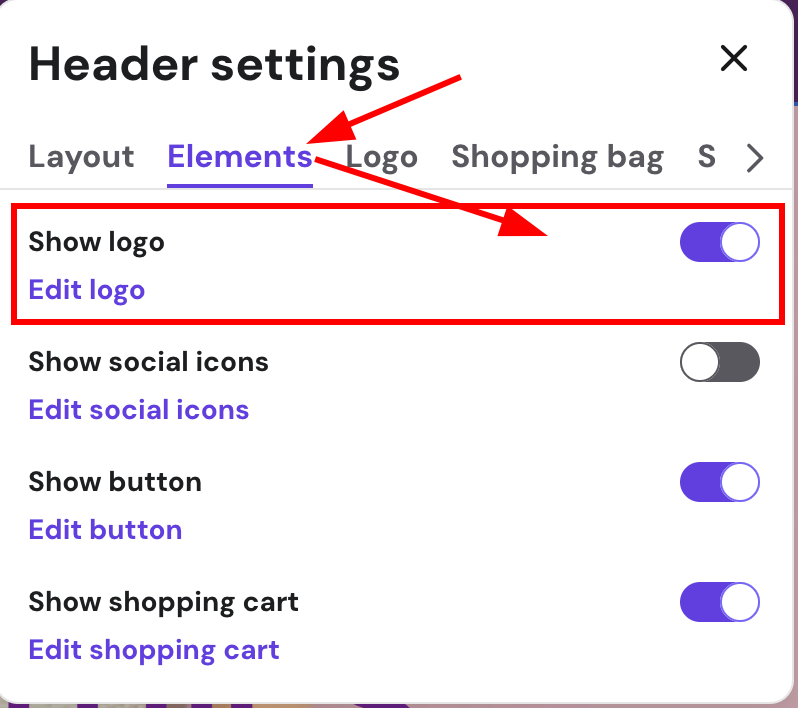 The logo is visible in the website’s navigation menu, also called the header section, which is the topmost section of your website. If you can’t see the header section, it’s likely that all your website pages are hidden from the navigation menu.
