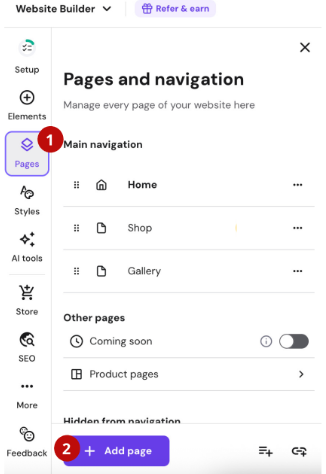 In Hostinger Website Builder, the easiest way to add legal pages is to create new pages via the Pages and navigation panel.
