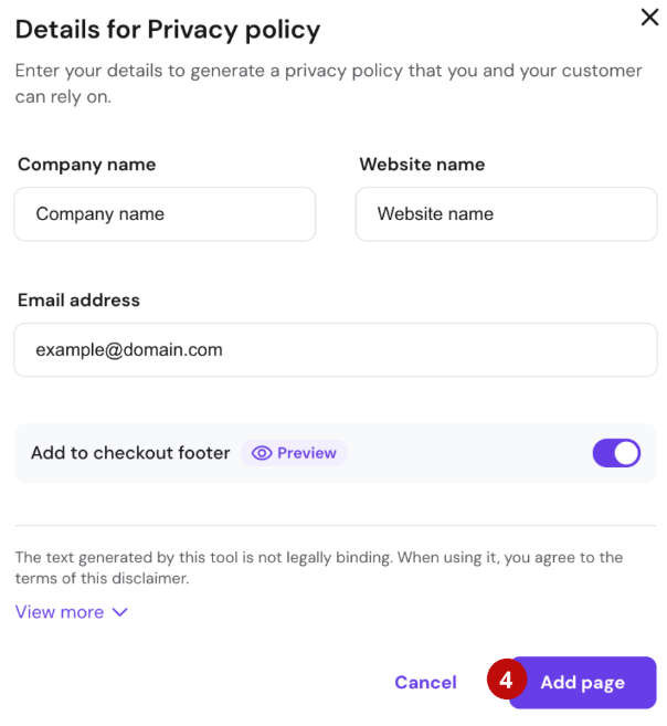 - Fill in the required information and click on the Add page. The page with generated content will be inserted into your site. You can edit and update this information anytime. Feel free to customize the page however you like! Also, make sure to enable the option Add to checkout footer in case you’re running an online store. This way, your legal page will become visible at the checkout.