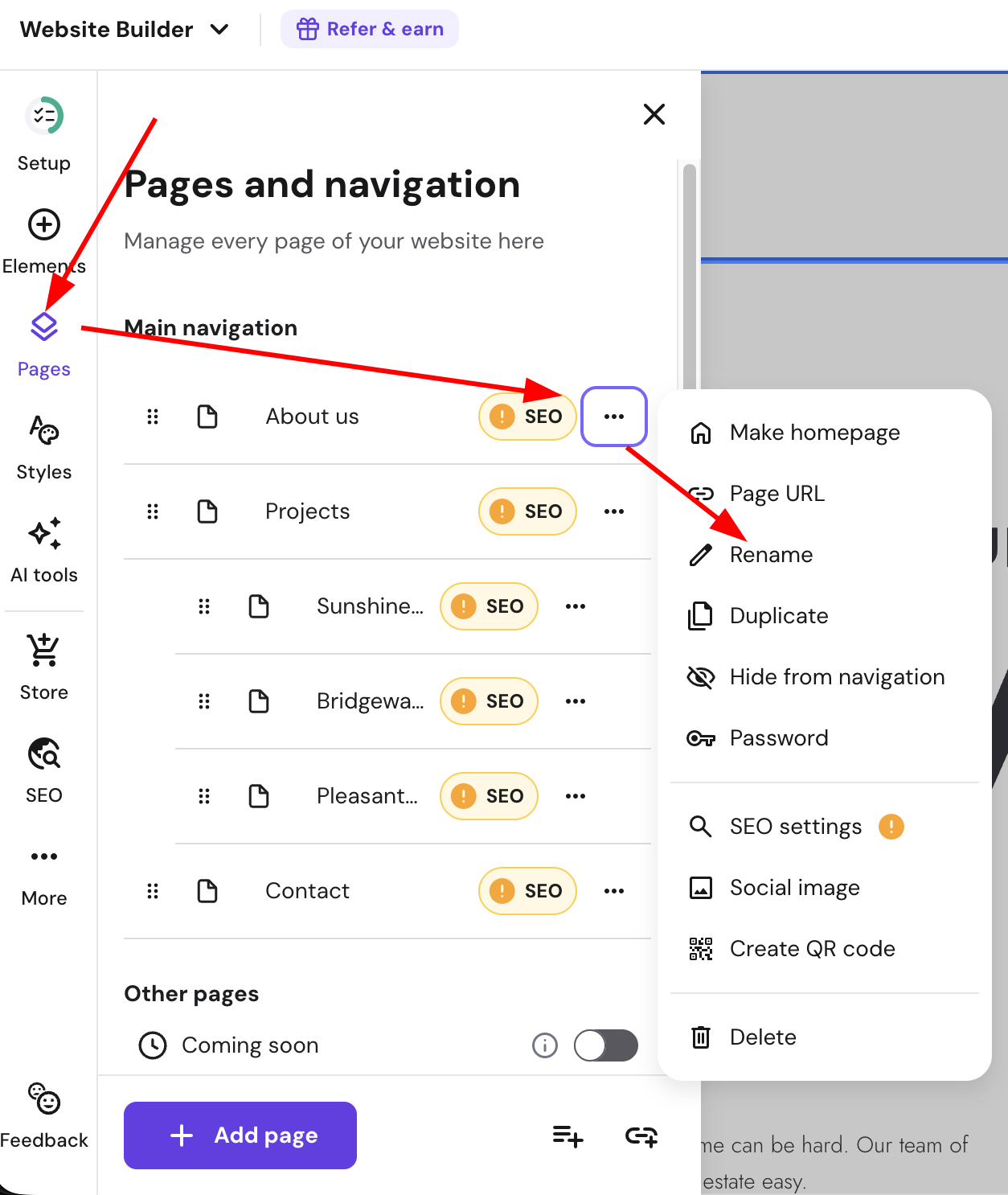 Learn how to rename your webpages using Hostinger Website Builder