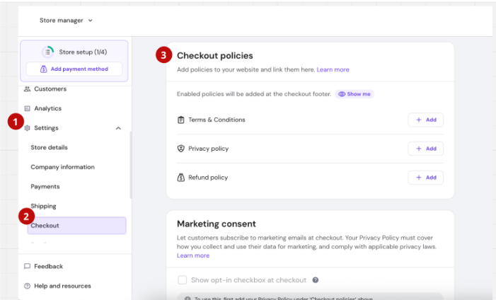 - Go to section Checkout policies. In the section you can add Terms & Conditions, Privacy policy and Refunds policy.