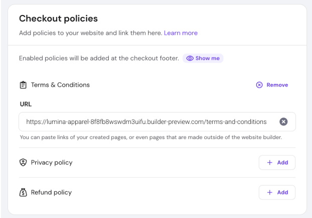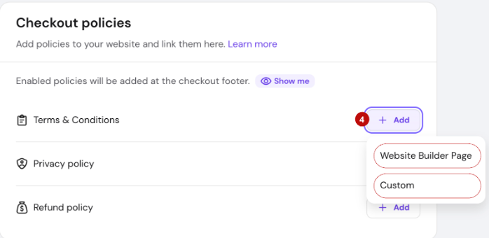 - To add specific policy select Add and choose from two options: Website Builder Page or add Custom link. This is an important step in order to ensure compliance with payment provider KYC requirements and build trust with your audience.