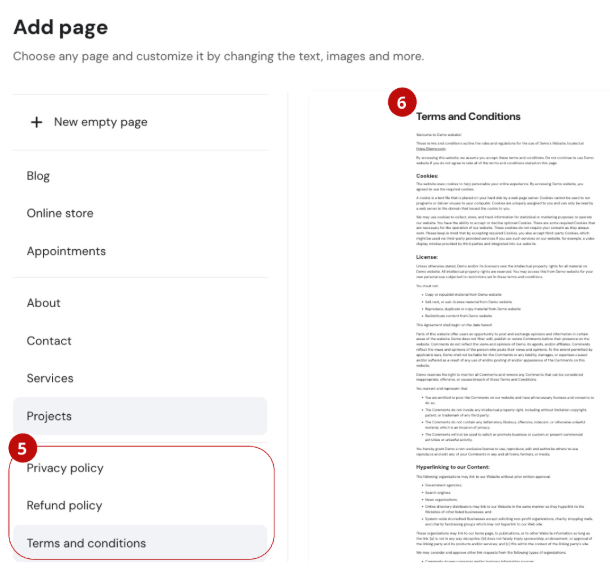 - Use the Website Builder Page option to add necessary legal pages to both your website and your checkout page. Once this option is selected, the editor will open in a new tab, where you will be asked to select the Add page into your website. Select one of the legal pages (Privacy policy, Refund Policy or Terms & Conditions).