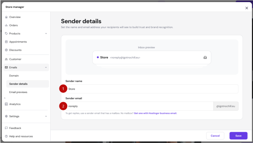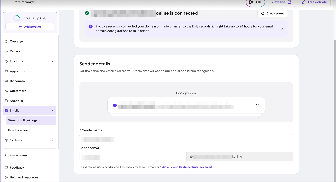If your store does not have a connected domain, transactional emails will be sent from: noreply@store.hostinger.com.