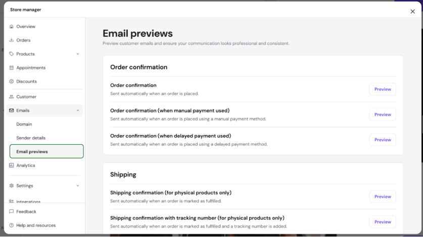 You can preview all automatically sent email notifications in your store management area. Go to: Store settings → Emails → Email previews.