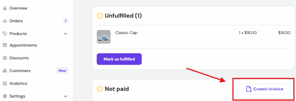 In the store management area, go to Orders, open the order in question, and click Create invoice: