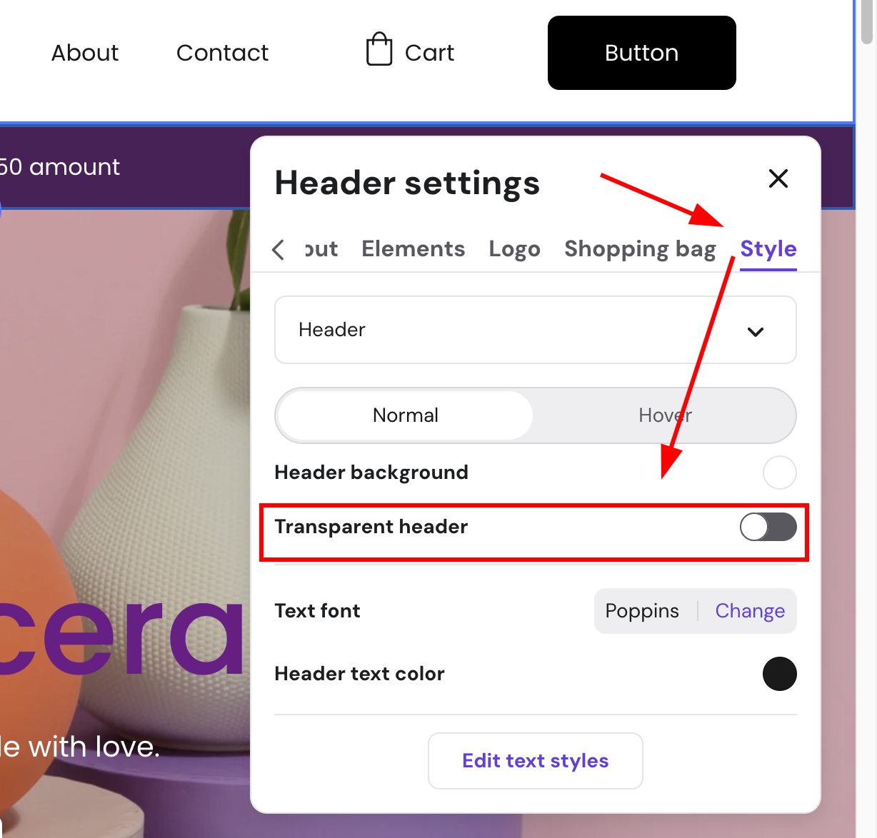Then, open the tab Style, and toggle on Transparent header. In this specific case, this would make the header purple, taking the color of the narrow section about free shipping: