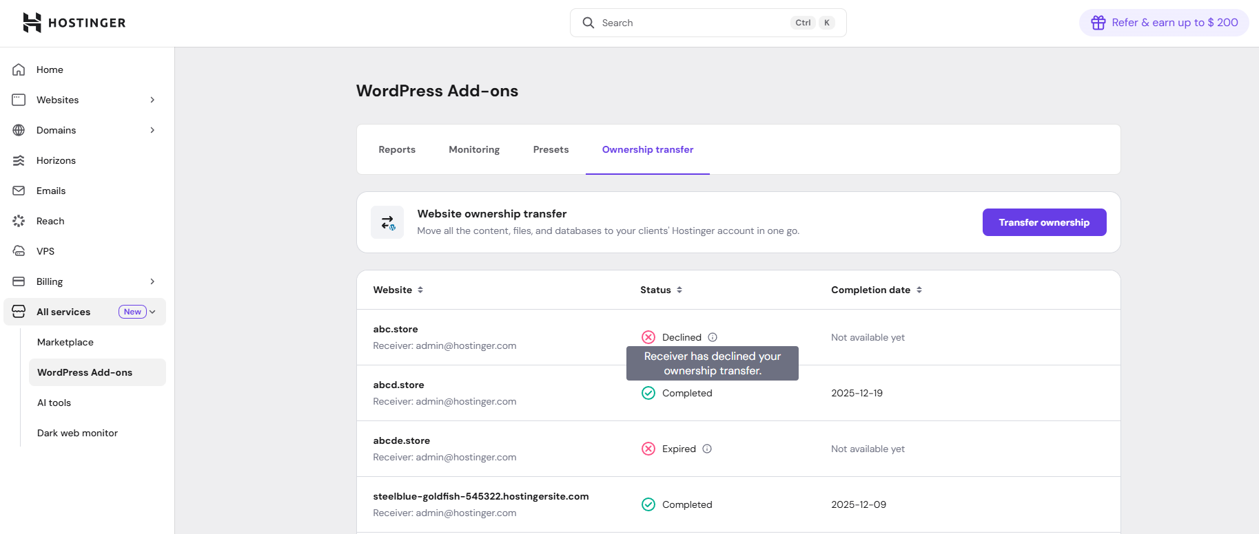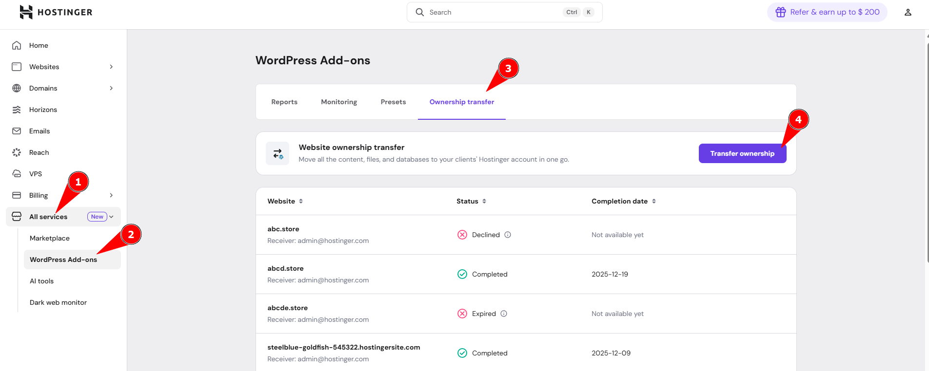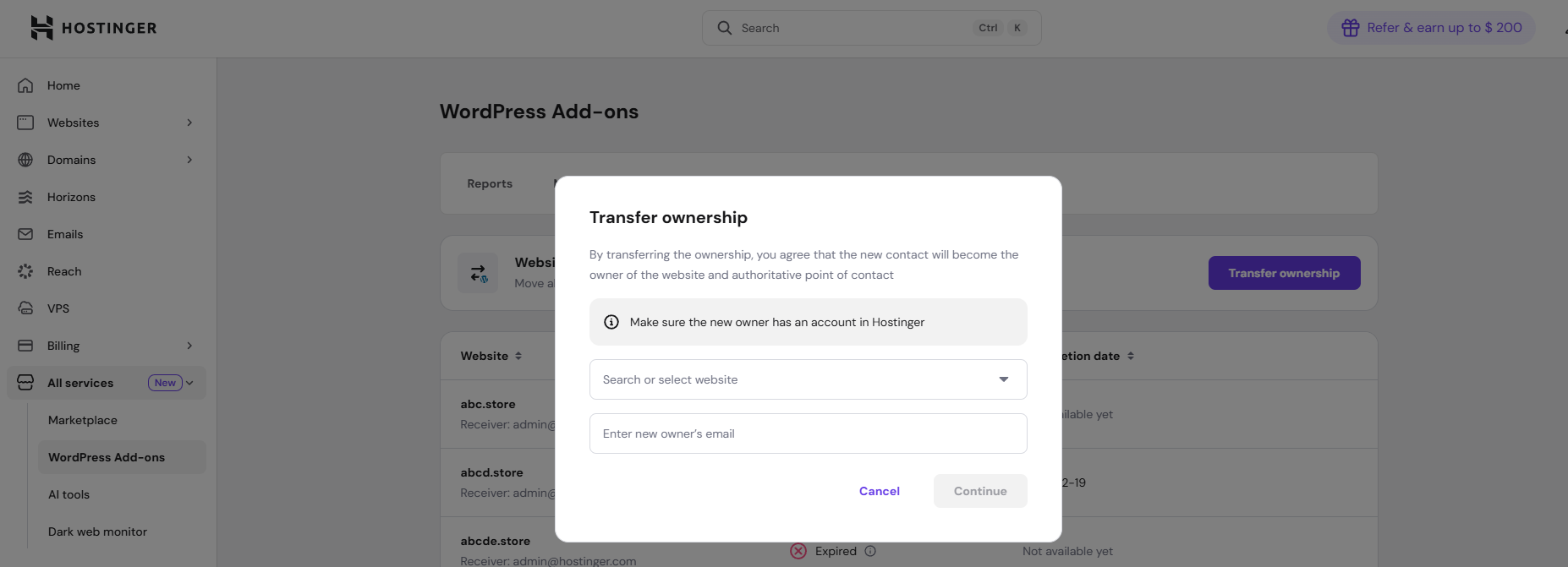Login to hPanel. Once logged in to your Hostinger account, go to All services and you will find quick access sections on the left sidebar. Click on WordPress Add-ons and navigate to the Ownership transfer tab. You can initiate a new transfer by clicking Initiate website transfer.