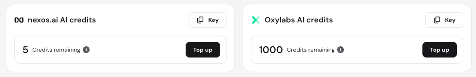 Oxylabs credits: These enable your application to access live web content and extract data. If you chose this option upon purchase, you will start with 1,000 free credits, which can be topped up at any time. More information: Oxylabs credits overview.