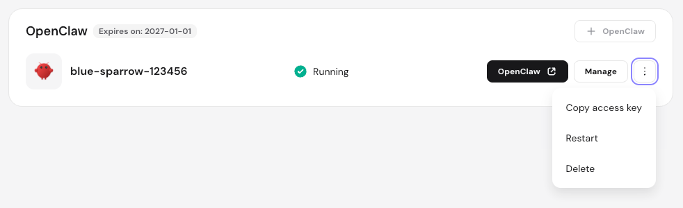 - Options (⋮): Click this button to copy your access key (gateway token), reboot, or delete your application.