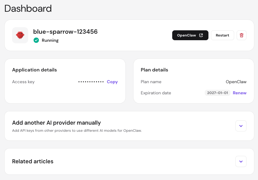 - Status: Indicates if your server is online. If the status is Running but you encounter errors, you may need to check your internal OpenClaw settings.