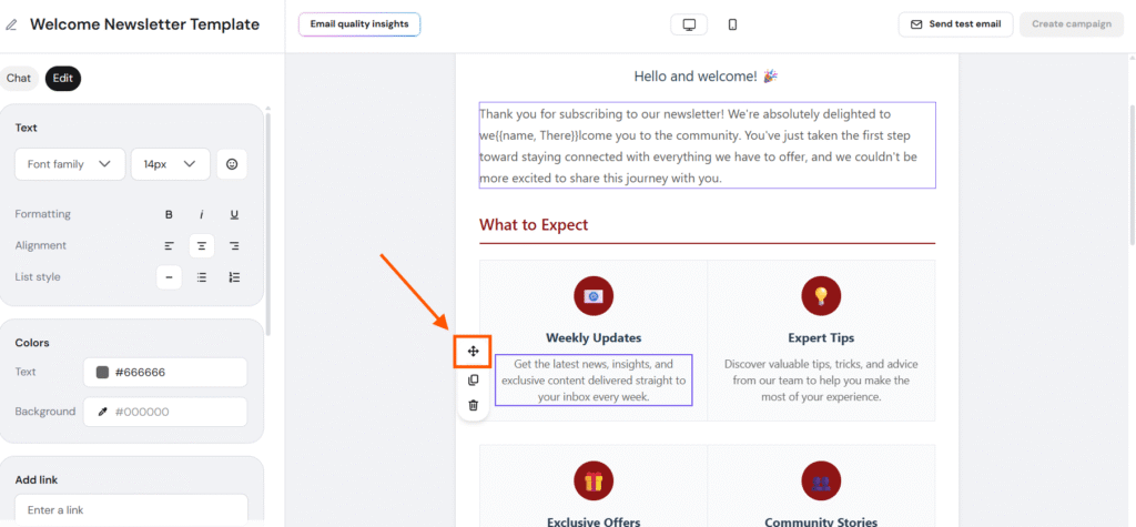 Email editor flexibility is key when creating campaigns that look exactly the way you want. With Hostinger Reach, you can now drag and drop elements inside your email templates, making it easier to reorder content and fine-tune your layout without rebuilding sections from scratch.
