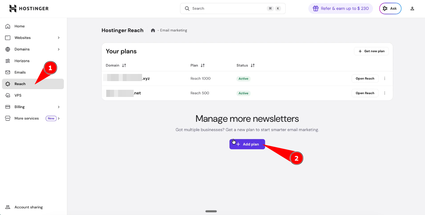 When you log in to your Hostinger account and open hPanel, you will see Reach in the main navigation bar.