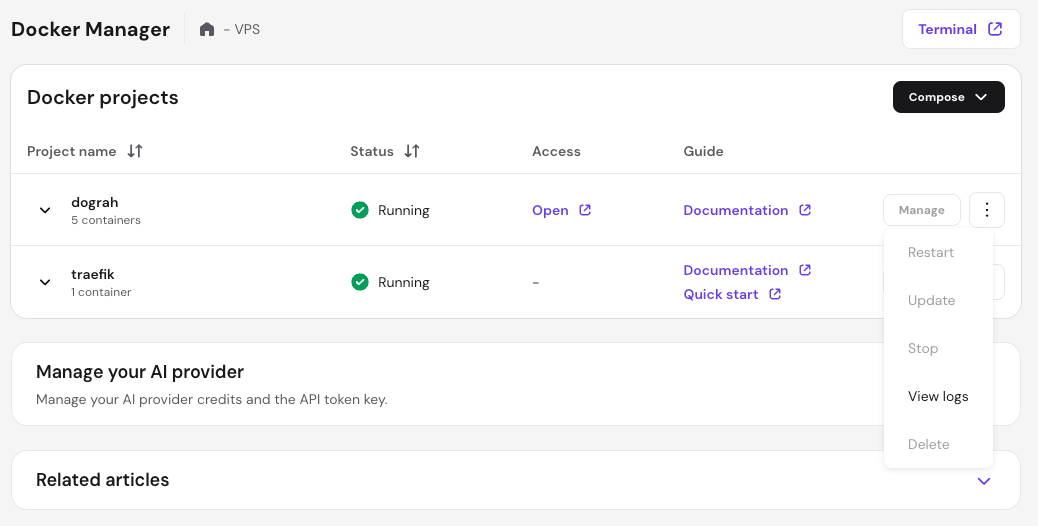Once a project is deployed on your Hostinger VPS, you can manage its option and monitor performance directly from the Projects page. This allows you to perform essential maintenance tasks such as updating configurations, checking logs for troubleshooting, or stopping services without needing to use the command line.