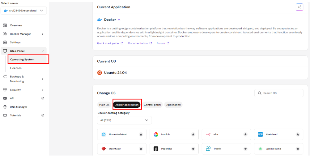 - In hPanel, go to VPS → Manage → OS & Panel → Operating System → Docker Application.