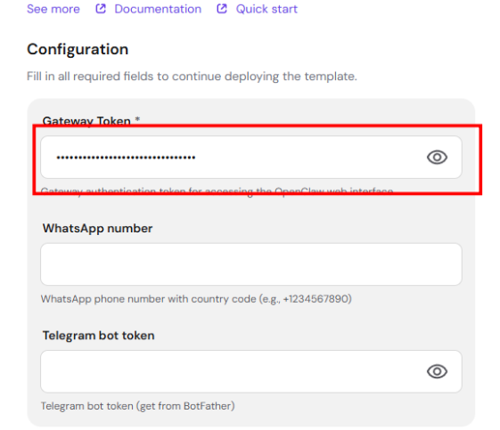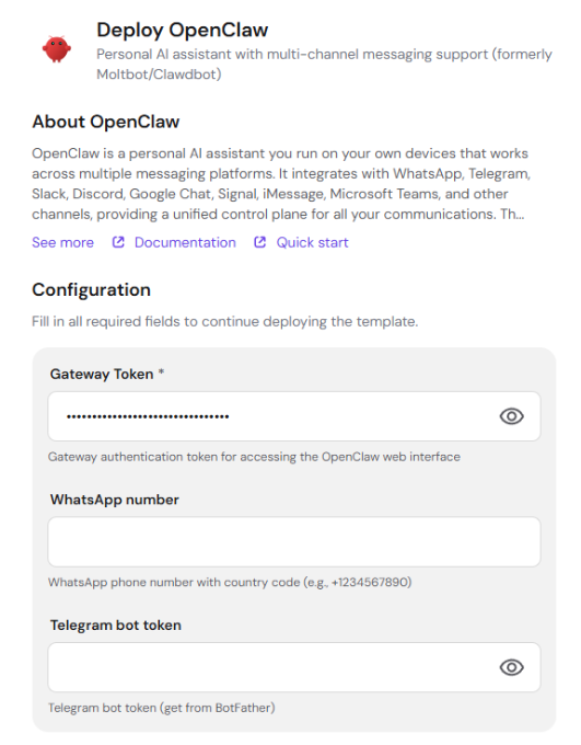 When deploying OpenClaw from hPanel, you can configure Telegram and WhatsApp directly in the deployment form.