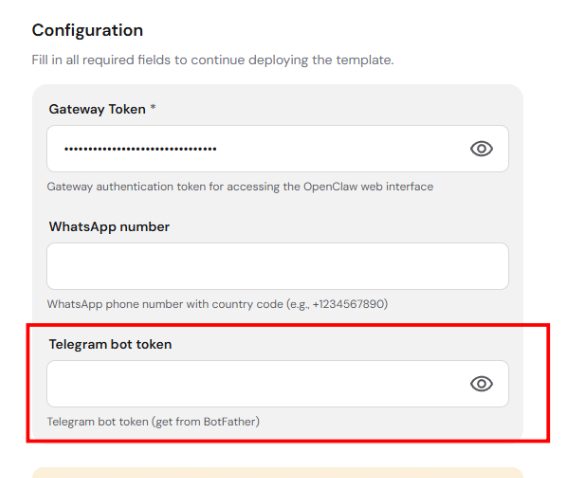 If you did not add your Telegram bot token during deployment, or want to connect a different bot: