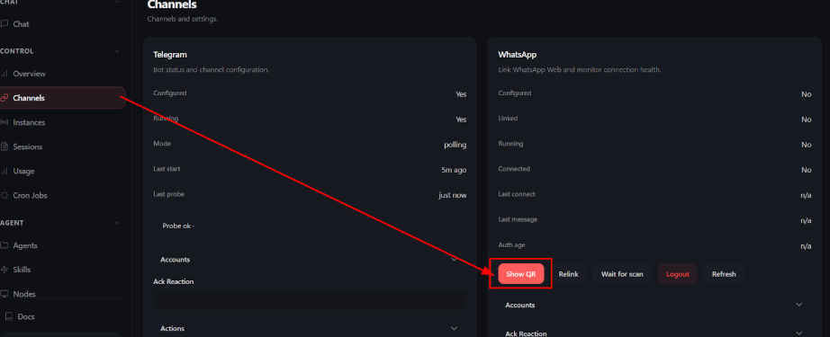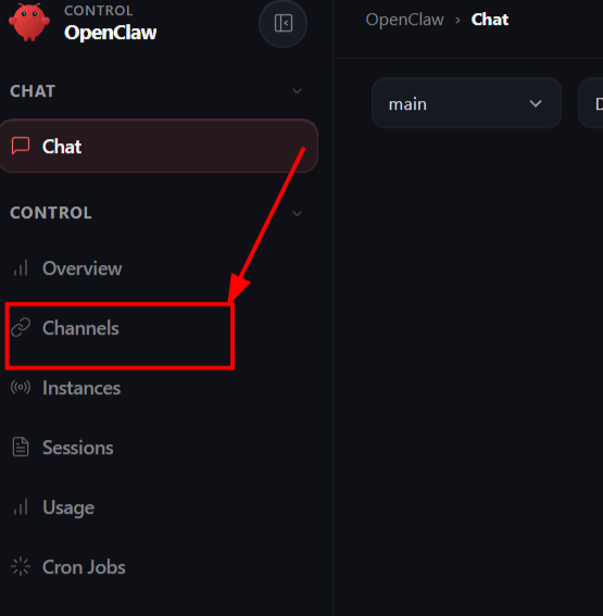 - In the OpenClaw dashboard, go to Channels.