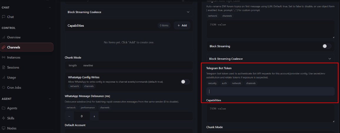 - In the Telegram section, add your bot token to the OpenClaw configuration.