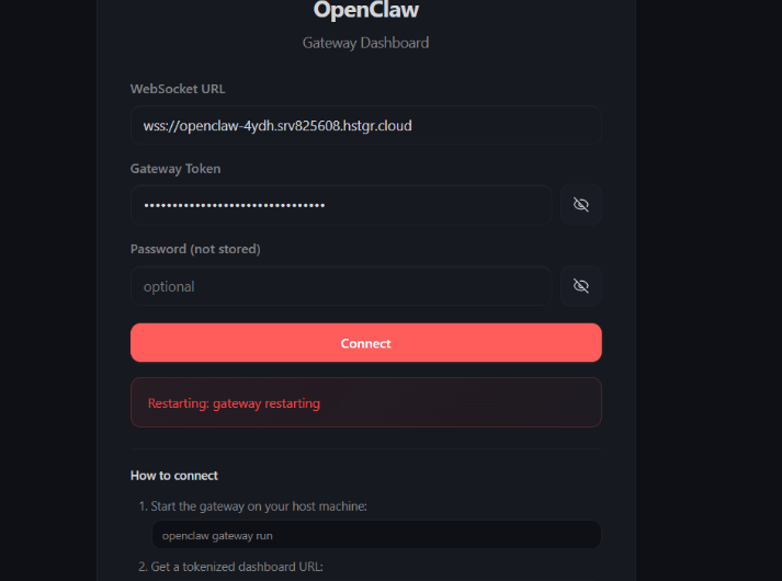 - Restart the OpenClaw container using hPanel or the docker restart command.