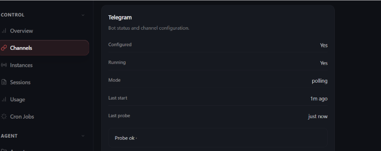 - Go to Channels and verify the Telegram section shows Running: Yes and Probe ok.