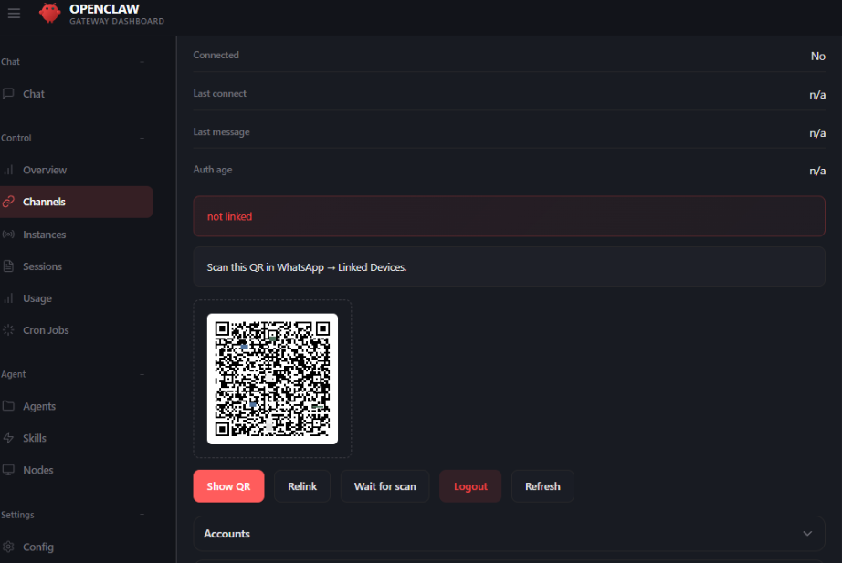- Scan the QR code displayed in the OpenClaw dashboard.
