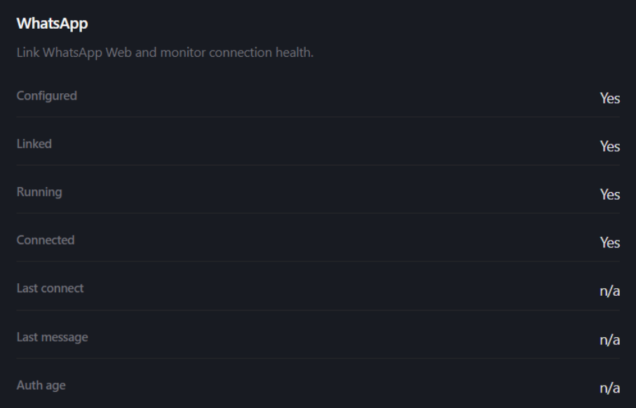 - Running – Whether the WhatsApp channel is active.