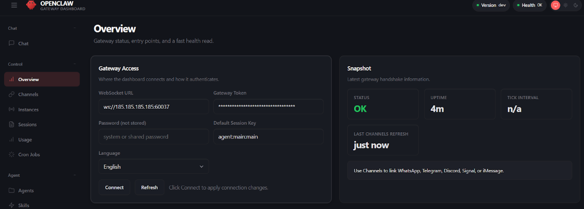 - Open the OpenClaw dashboard and check the Health indicator in the top-right corner. It should display Health OK.